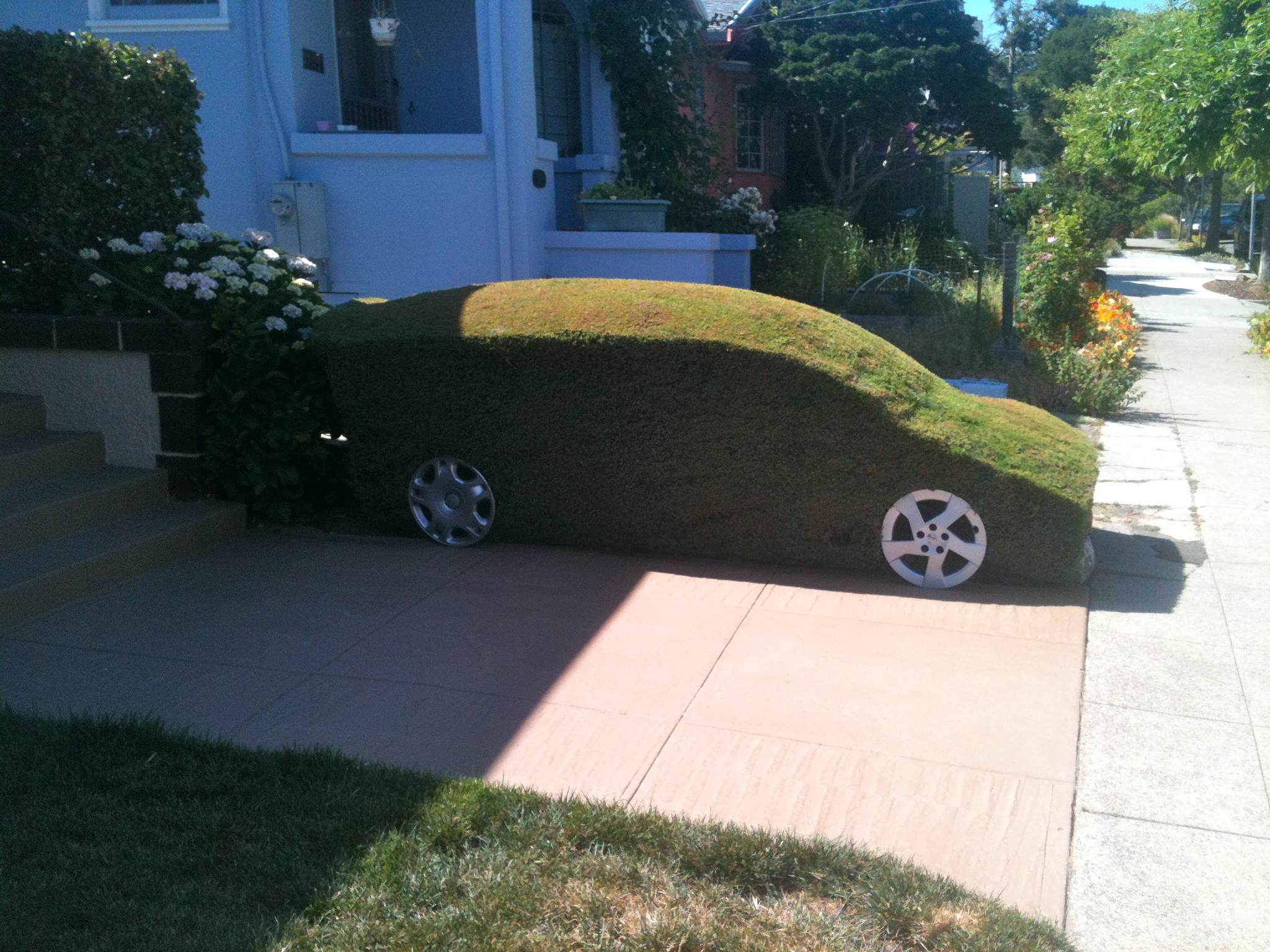 I saw this car-shaped hedge growing in a Berkeley neighbor hood and knew that it had to be a weekend postcard. Berkeley must have more Toyota Prius‘s per capita than anywhere else on earth. And, just down the street sits an all-electric car made by a company I have never heard of. But this car beats all those others. Not only is this car Zero-Emissions green, it absorbs CO2 rather than emitting it. I dub thee the Topiary DL.